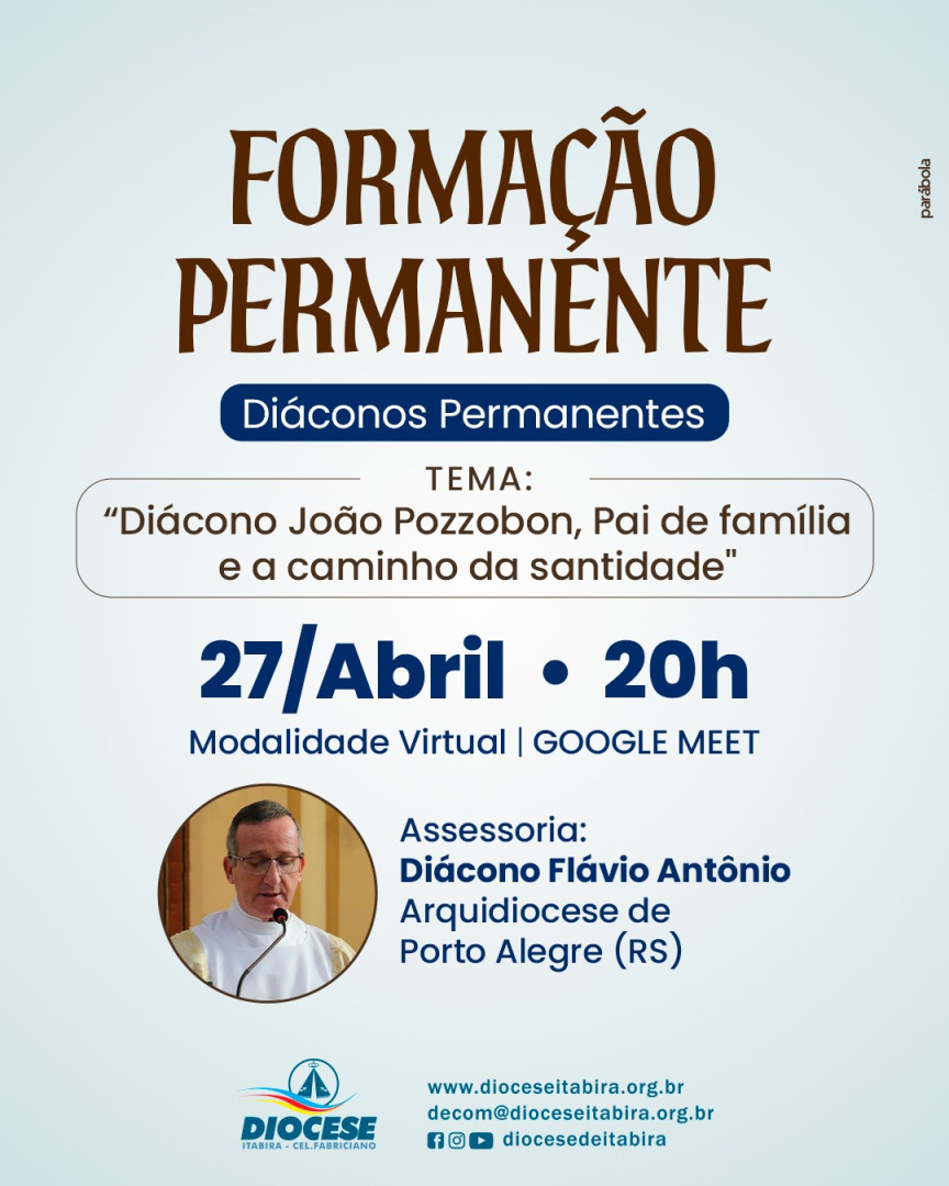 A Comissão Regional dos Diáconos Permanentes Leste 2 (CRD Leste 2) e a Diocese de Itabira / Coronel Fabriciano convidam você para um momento de formação, espiritualidade e crescimento na fé com o tema: “Diácono João Pozzobon, Pai de família e o caminho da santidade”. Uma oportunidade para refletir sobre a vocação, a vida familiar e o chamado à santidade a partir do testemunho de um homem que viveu intensamente sua missão.